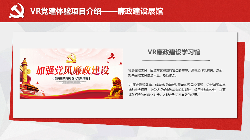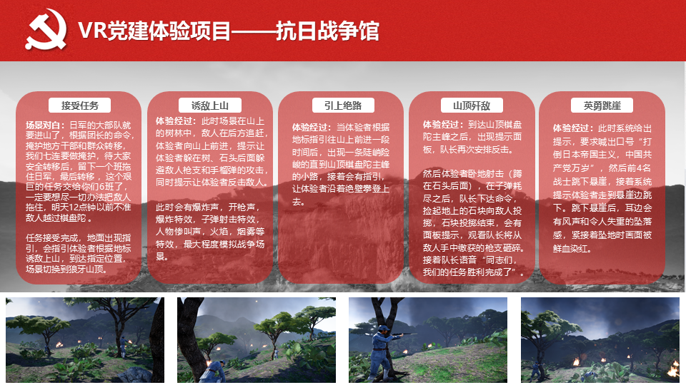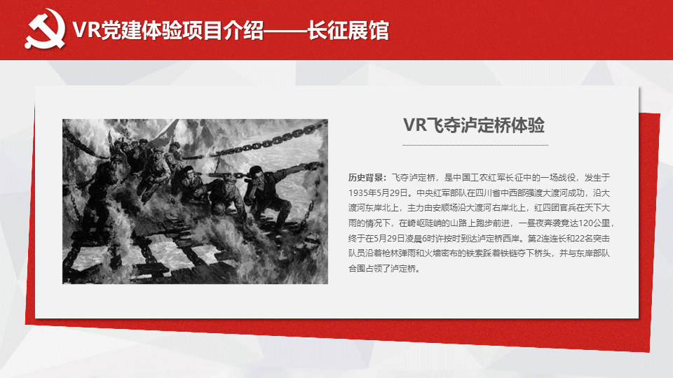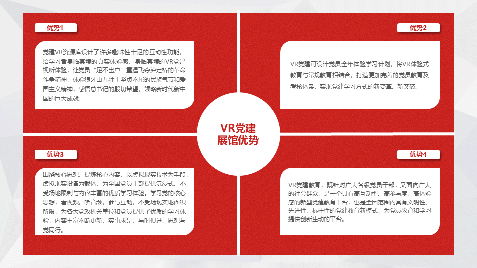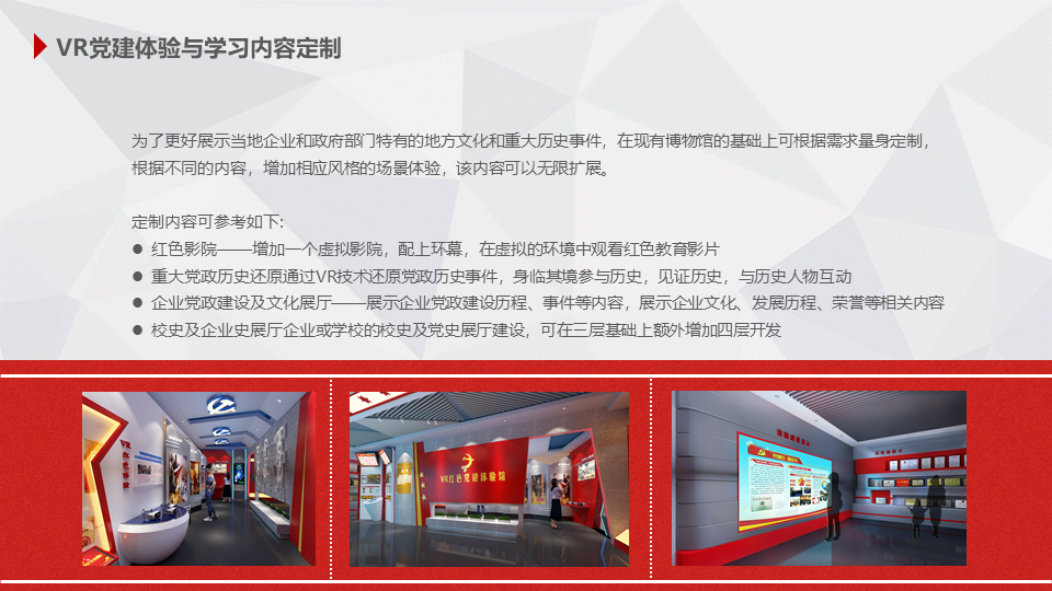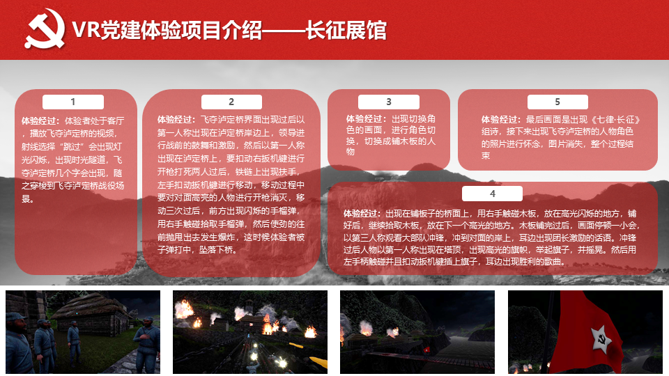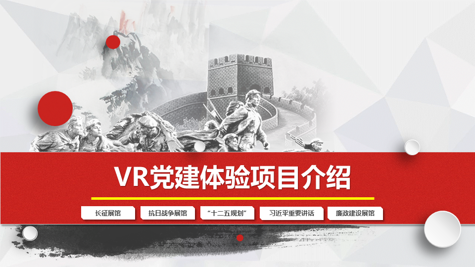 VR党建体验馆是通过虚拟现实技术开发的党史资料学习系统,以国内428家爱国主义教育示范基地为对象,通过戴上VR眼镜就能够让参与者自主学习党建,在历史的长河里漫游,观看中国建党大事件,学习党建精神。打破传统体验式红色教育的时空限制,真实再现红色革命场景,为党员干部们提供体验式参观游览、革命历史知识学习、革命传统精神教育等服务