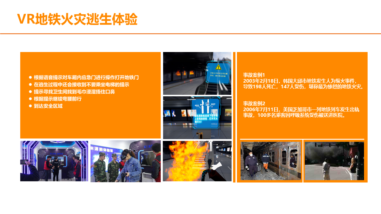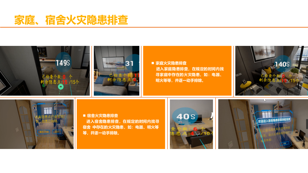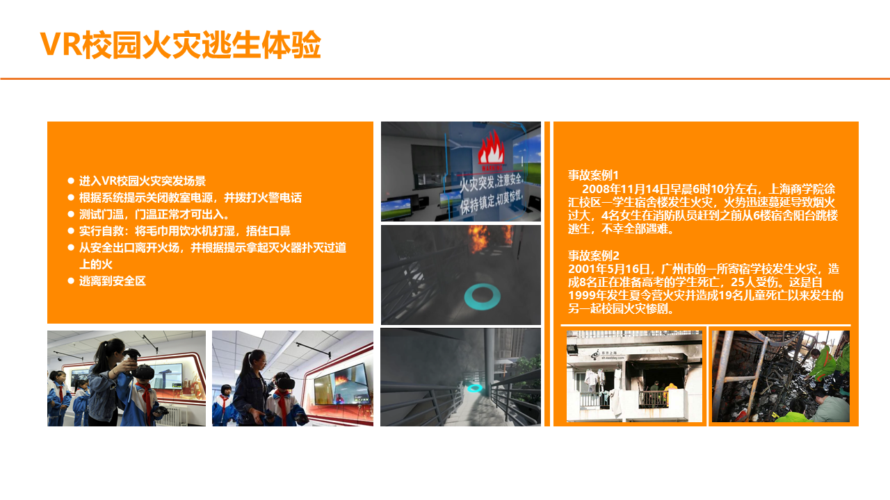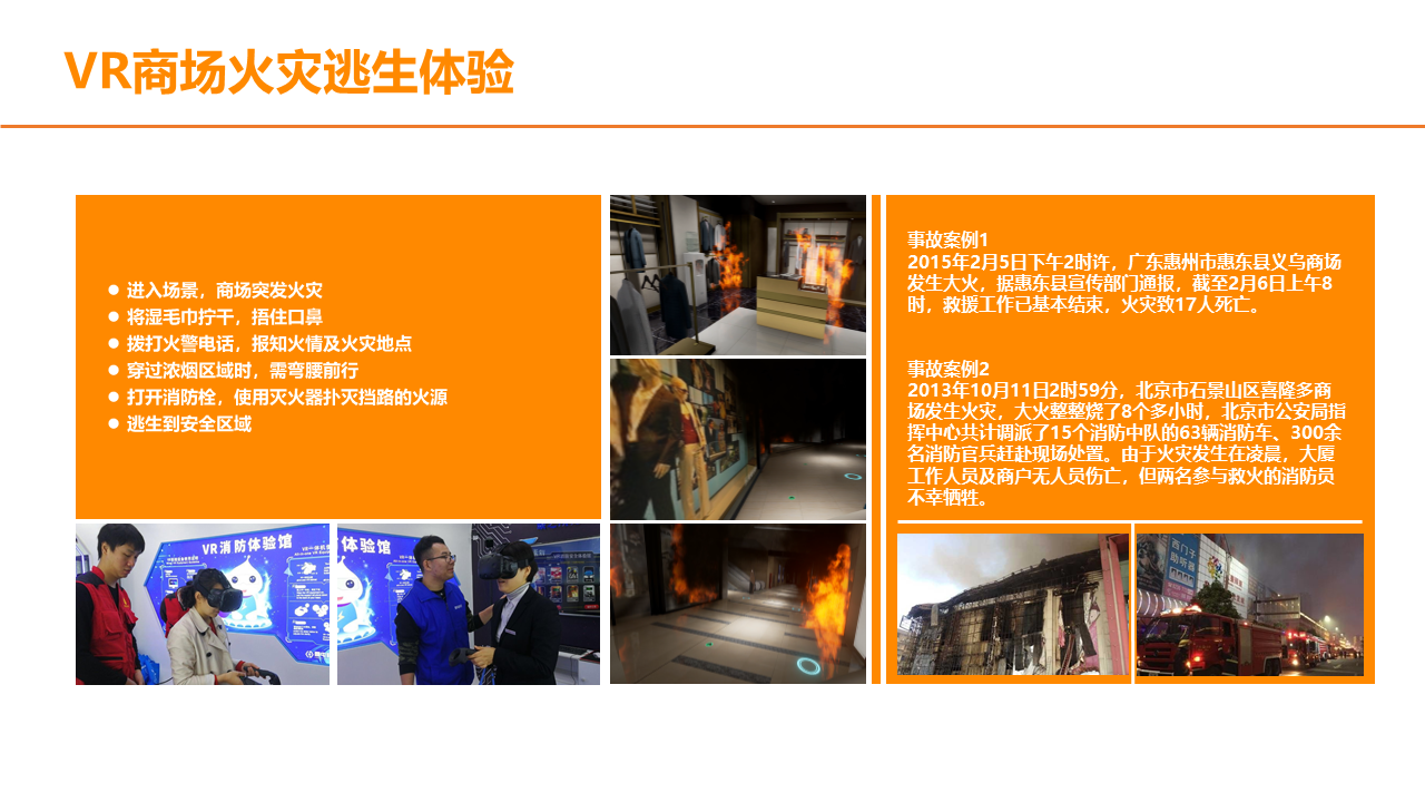 VR火灾逃生演练系统,根据不同场景设置火灾逃生方式,100%还原火灾发生场景,五大交互环节,让体验者5分钟学会应急处理技巧。5个交互环节+5个交互情景,身临其境体验火灾发生的整个过程,场景100%还原,效果逼真。