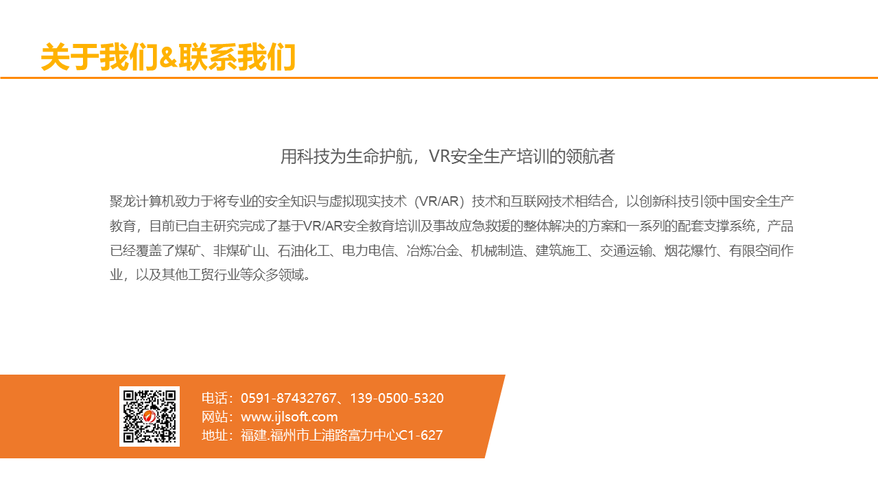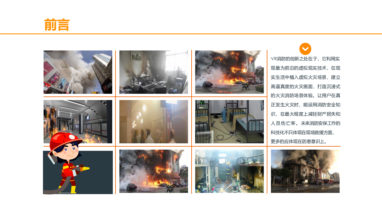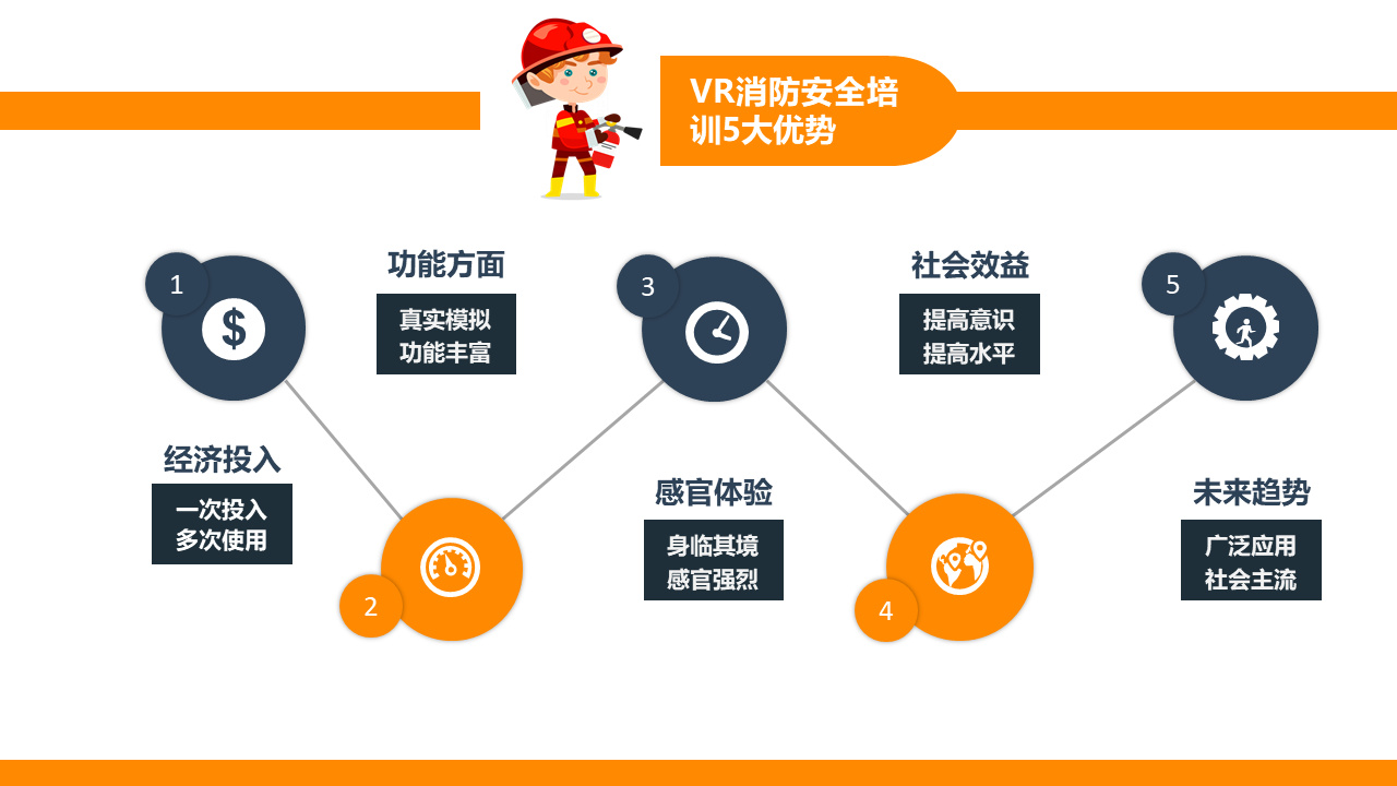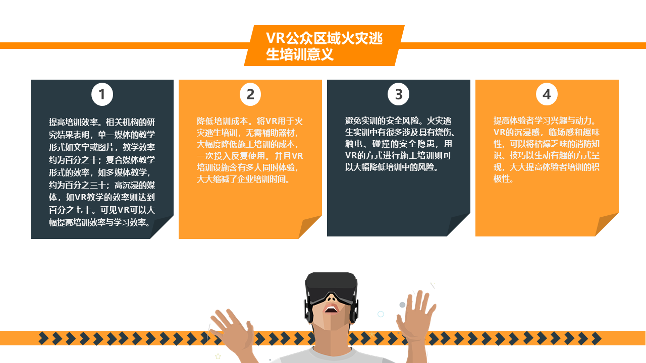 VR火灾逃生演练系统,根据不同场景设置火灾逃生方式,100%还原火灾发生场景,五大交互环节,让体验者5分钟学会应急处理技巧。5个交互环节+5个交互情景,身临其境体验火灾发生的整个过程,场景100%还原,效果逼真。