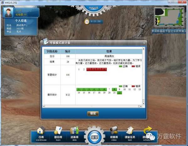 无纸化考试,智能化考核软件以游戏任务的方式进行趣味性十足,同时课前会有课堂概述、施工准备、教学目标等知识点,课程中穿插了技术要点,课程结束后会有课堂回顾等内容,知识性与趣味性并行,课后软件独有的考核模式,可在三维仿真场景中完成实景考核,并且对考试成绩进行统计和细致解析。