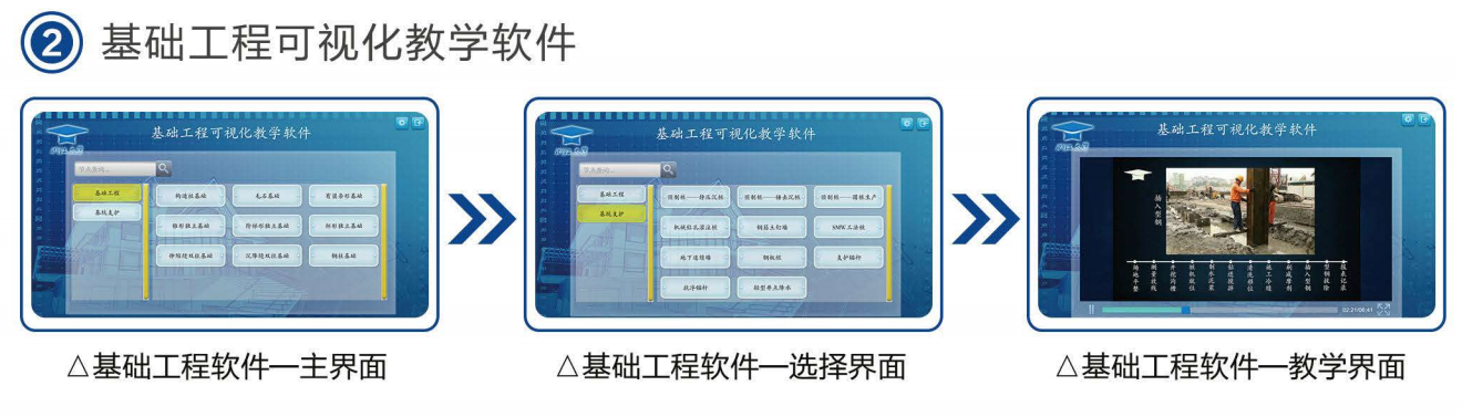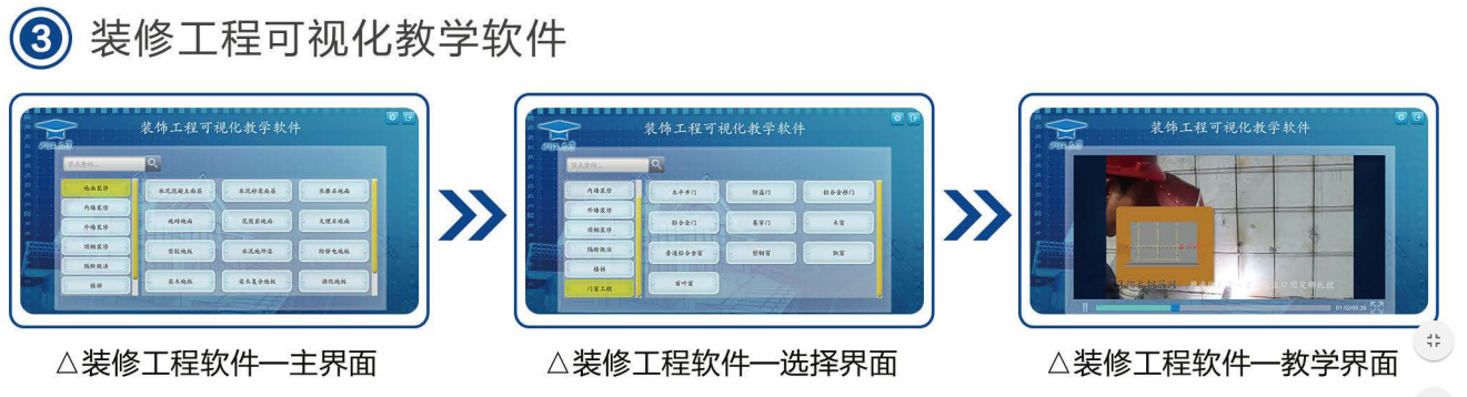 根据国家最新建筑施工手册编写剧本,以视频或者动画的形式记录分项工程的施工全过程,并辅以国家级播音员的配音音频,形成视频、音频、字幕三结合的技术指导型微课资源,将其填充到专用教学软件中,形成可视化教学软件。并且为每个可视化资源配备了针对性的测试考题,以便全面监控学生对相应可视化化资源相关知识点的学习情况。为方便不同课程师生使用本软件,将可视化教学资源软件分为以下类别: