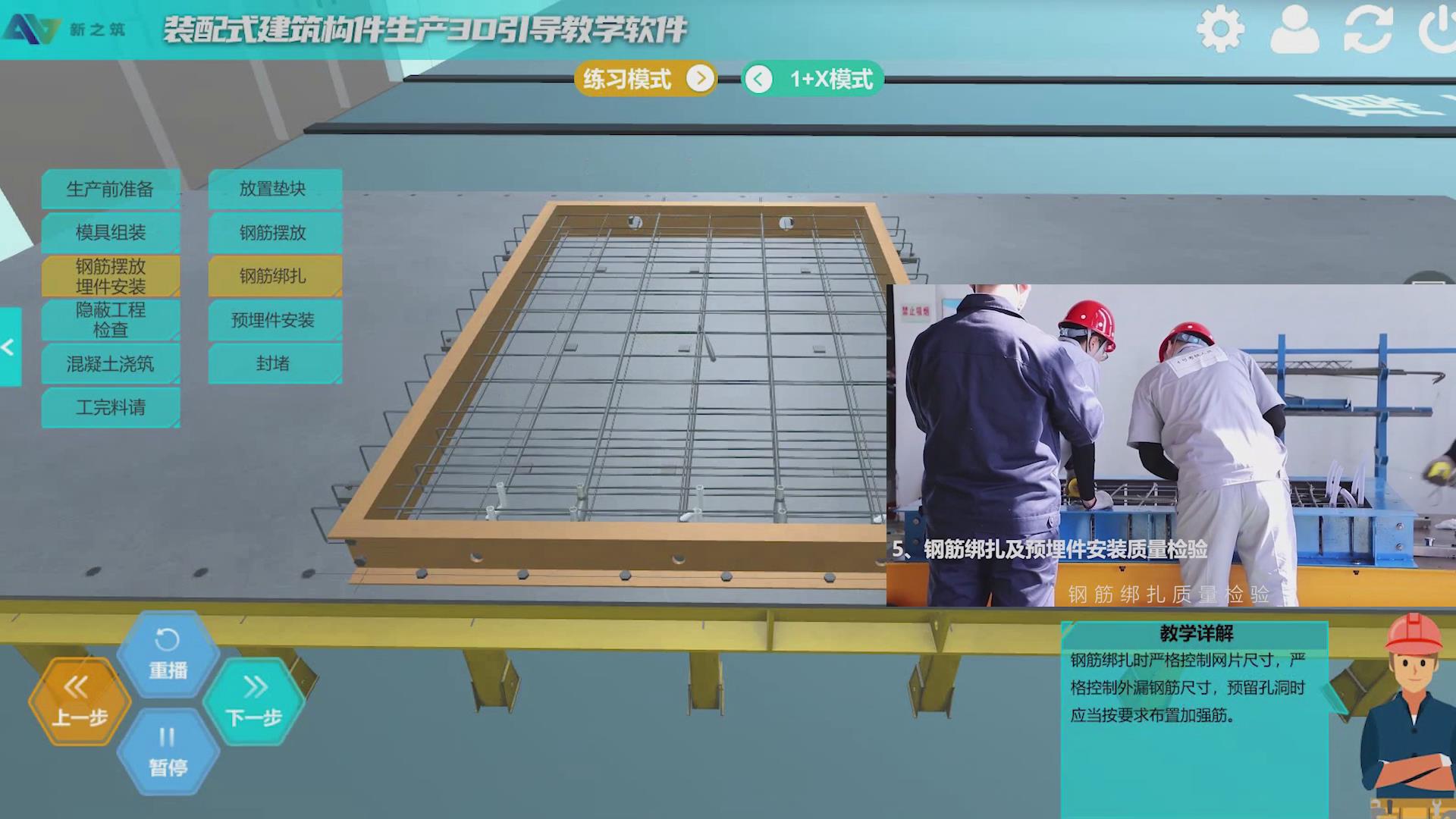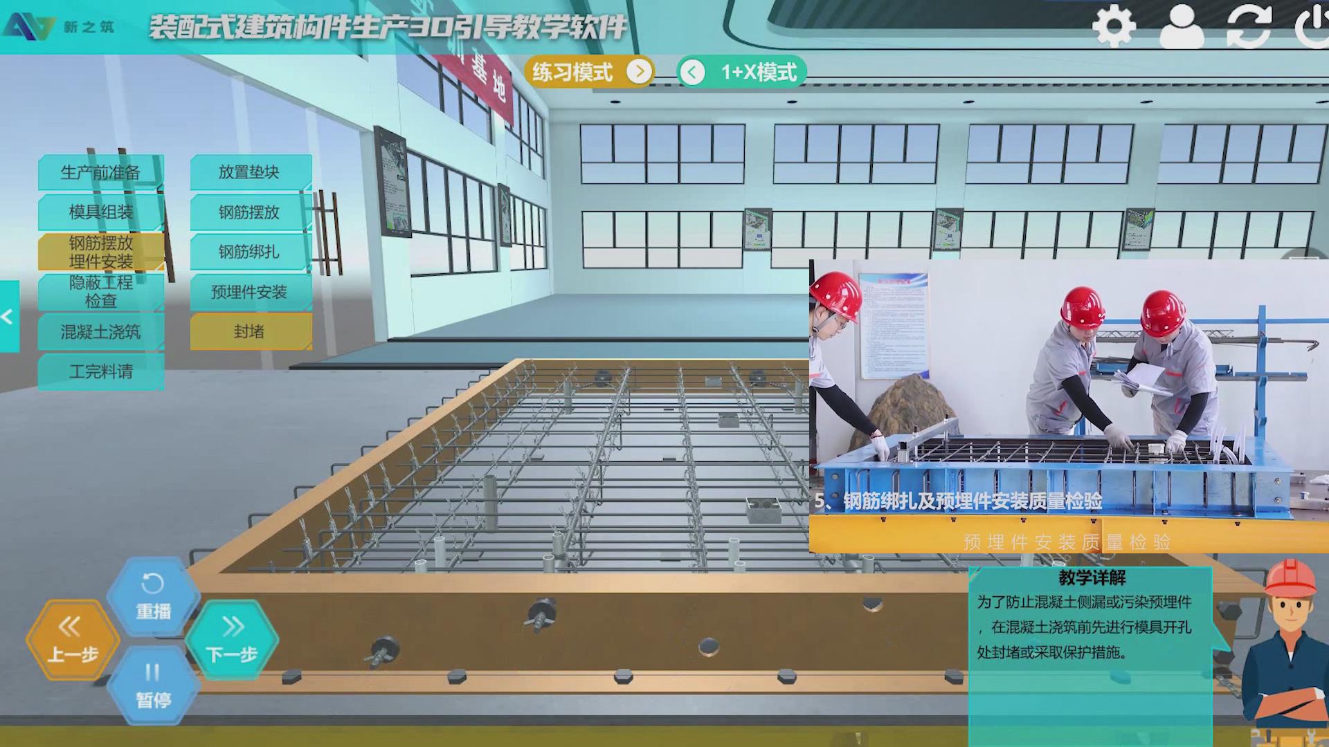 装配式建筑构件生产岗位技能实操平台3D仿真软件,配套构件生产岗位技能实操装置使用。软件通过虚拟仿真技术,虚拟仿真实体设备实操场景,通过操作引导教学方式引导学生在虚拟场景下进行实操装置训练及相关构件生产工艺知识学习。可同时满足40人以上的班级同时在线操作,可在仿真环境操作熟悉后再进行实体操作。软件可在PC端或手机移动端操作,操作场景灵活方便。
