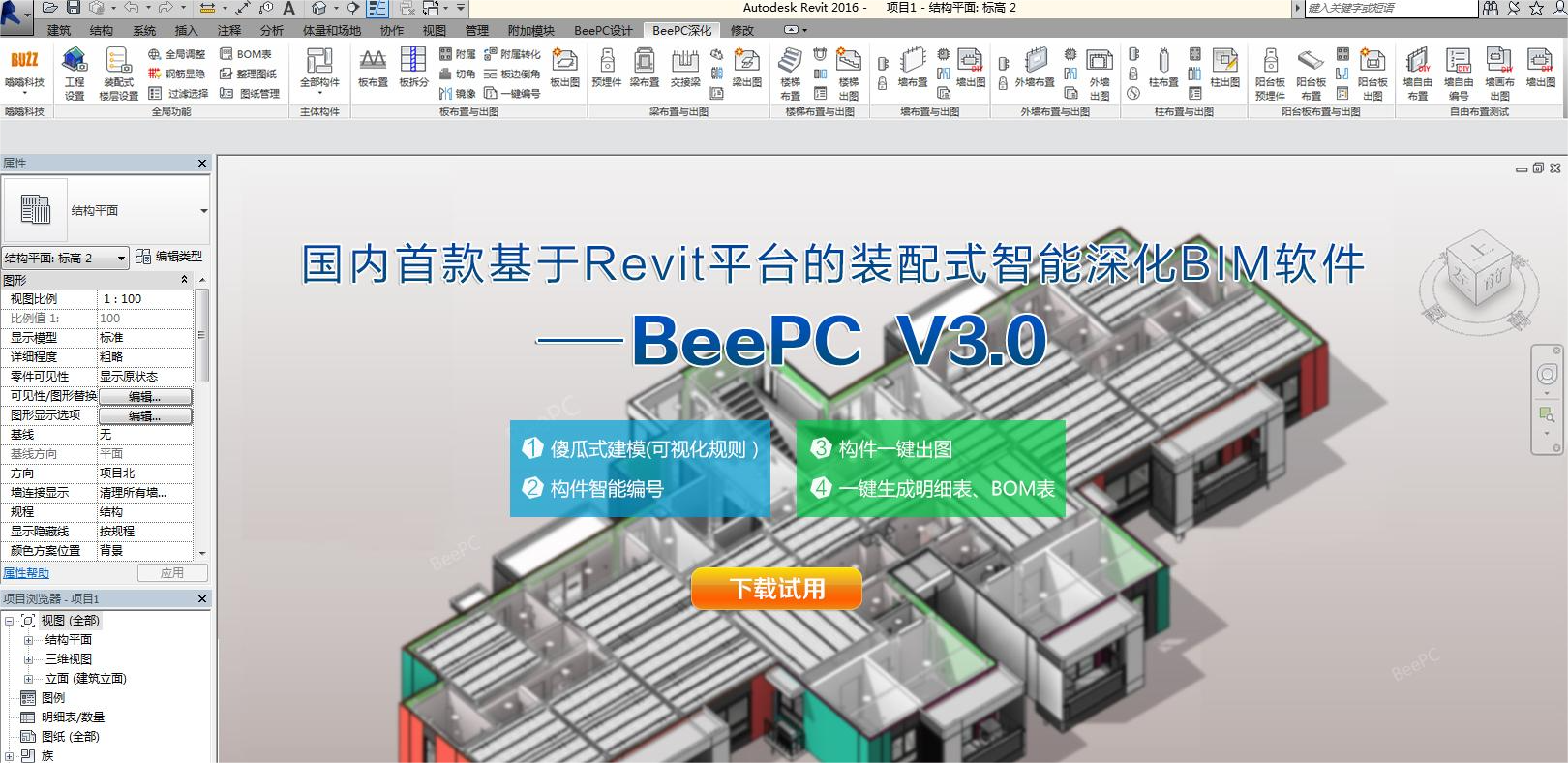 BeePC深化设计软件是目前广受国内设计院装配式建筑结构设计师喜欢的基于Revit平台的装配式建筑智能深化BIM软件,是一款内置规范与图集、可以边视频教学、边建模做装配式深化设计的BIM软件。软件具备可视化操作、傻瓜式建模、构件智能编号、一键出图、一键生成构件明细表(含钢筋形状和尺寸)和一键生成工厂BOM表等特点,且根据用户需求持续增加各种人性化、提高工作效率的功能,帮助用户方便、快捷地学习装配式建筑相关规范、BIM+PC建模及出图出量。