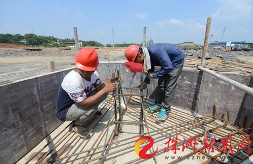 8月13日上午10时,金山工业园。热浪灼人。中天杭萧钢构装配式建筑生产基地项目施工仍在有序进行。桩基已经建好,承台、地梁部分正在抓紧建设。