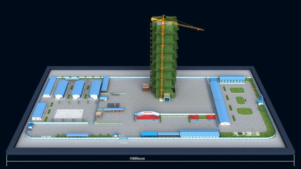 3、生活区包含:1座食堂、1座娱乐活动室和洗浴间、3座两层活动板房宿舍,配套一个篮球场、洗衣池;工作区包含:2座1层活动房和1座两层活动房、1个停车场、1根旗杆;作业区包含:钢筋加工区、木工棚、木工材料堆放区等等,1座不低于8层的在建大楼,外围脚手架及防护网,1座升降机和1座塔吊,塔吊可360度旋转;公共区包含:1个配电室、1个保安房、3个停车棚和1座活动板房休息室、1个演讲台和1个构件搭设展示区。