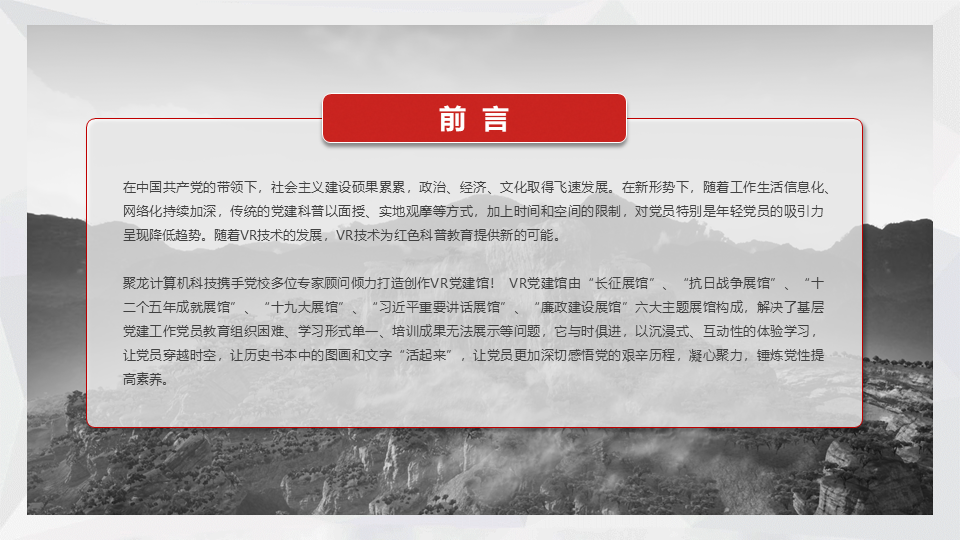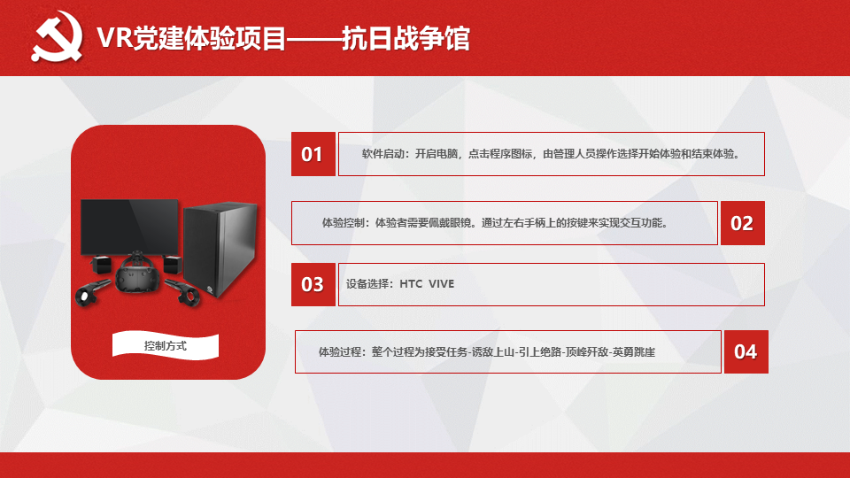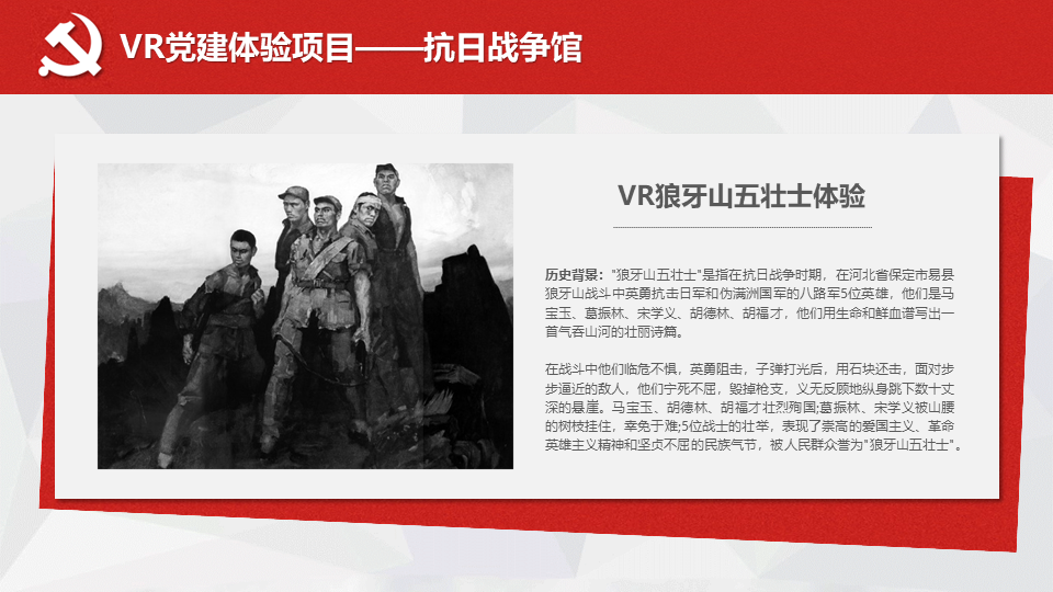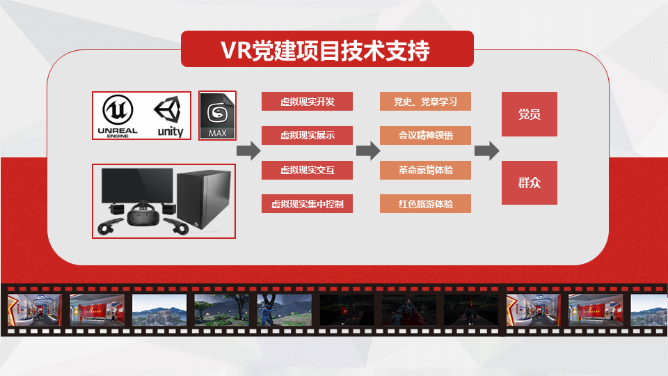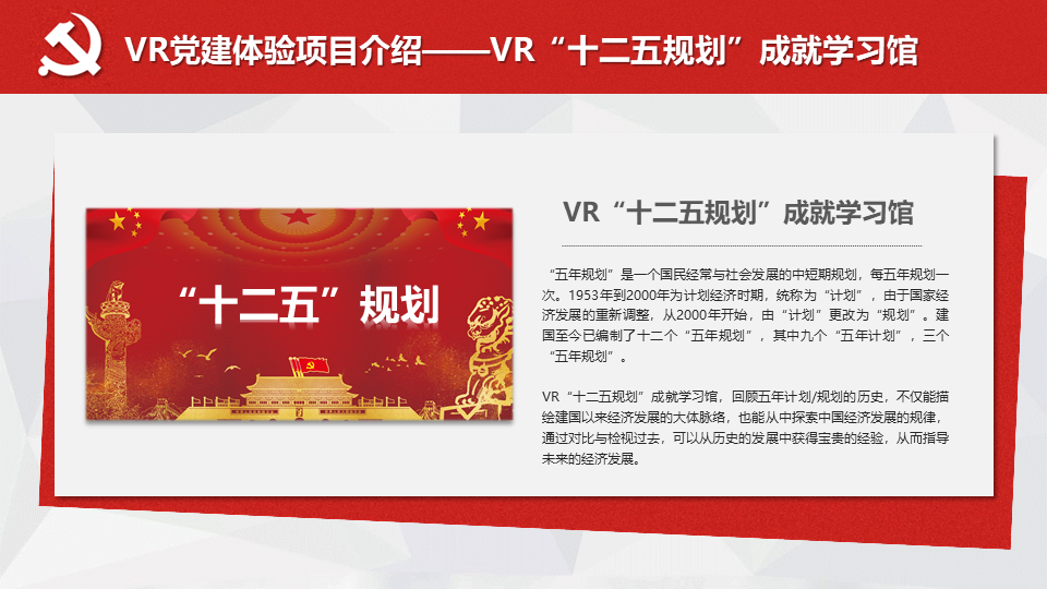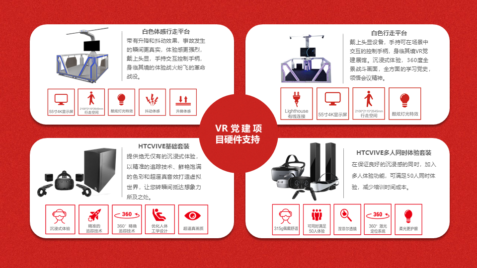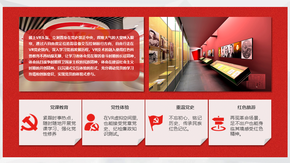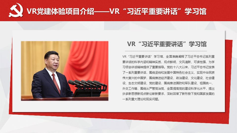 VR党建体验馆是通过虚拟现实技术开发的党史资料学习系统,以国内428家爱国主义教育示范基地为对象,通过戴上VR眼镜就能够让参与者自主学习党建,在历史的长河里漫游,观看中国建党大事件,学习党建精神。打破传统体验式红色教育的时空限制,真实再现红色革命场景,为党员干部们提供体验式参观游览、革命历史知识学习、革命传统精神教育等服务