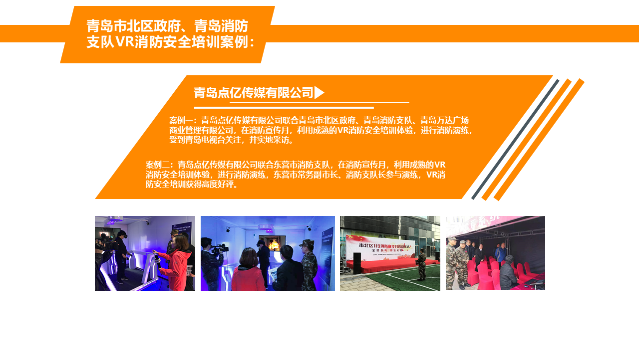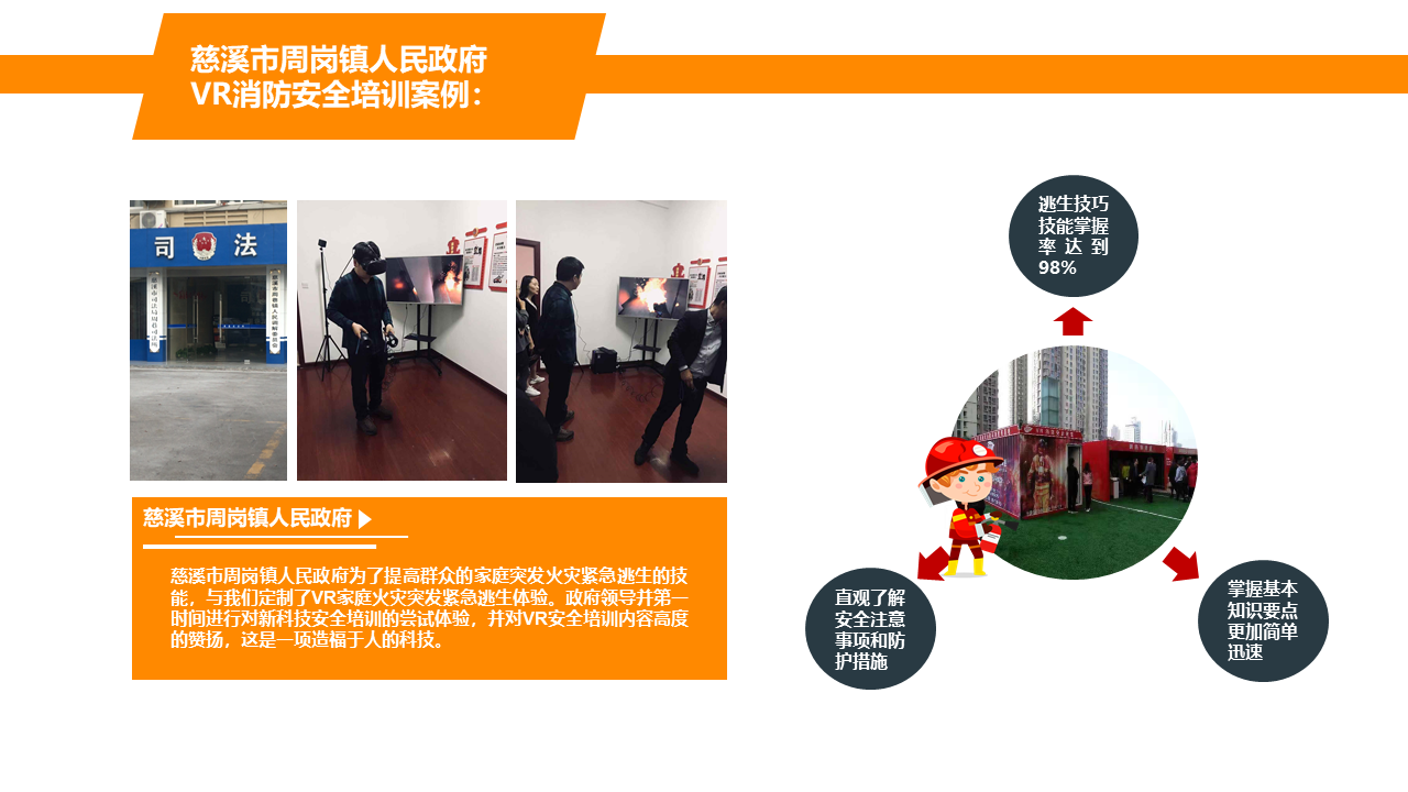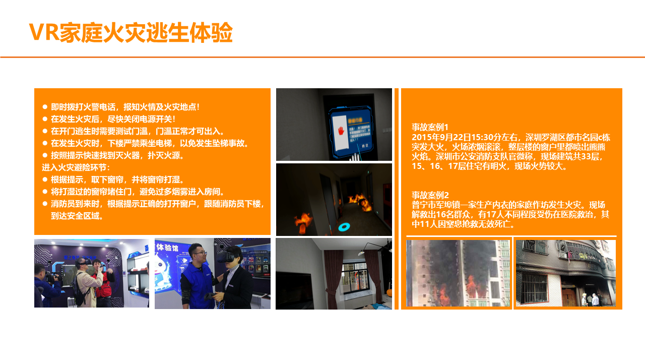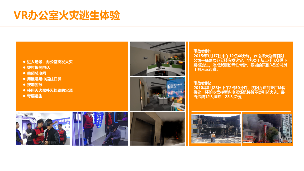 VR火灾逃生演练系统,根据不同场景设置火灾逃生方式,100%还原火灾发生场景,五大交互环节,让体验者5分钟学会应急处理技巧。5个交互环节+5个交互情景,身临其境体验火灾发生的整个过程,场景100%还原,效果逼真。