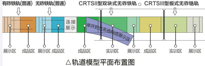 轨道交通实体教学模型包含有砟轨道、 RISI型双块式无砟轨道和 RTSIIIE型板式无砟轨道三种类型,通过成品和半成品的对比,展示出轨枕、扣件、钢轨、道砟、18号道岔、钢筋构造、精调抓、限位凹槽、锚固孔、抗裂布、轨道板、CPII控制点等节点构造,并在每个节点上张贴教学二维码,达到虚实结合的教学效果。课堂中,老师带领学生通过现场观摩、实测实量现场扫码等教学手段能使学生非常直观的掌握教学重点和难点。