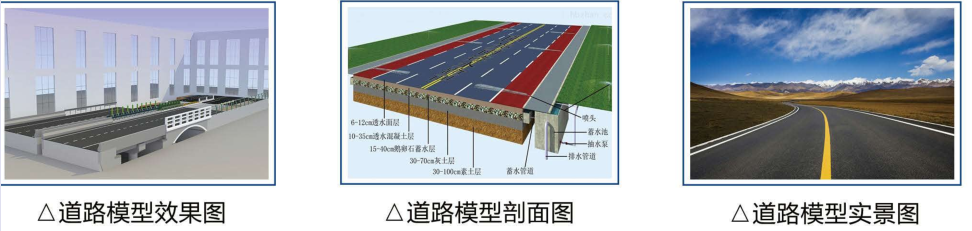 市政道路实体教学模型包含中级公路路面、高级公路路面、高速公路路面、城市道路路面、过水涵洞及城市管道等类型,通过成品和半成品的对比,展示道路地基、沥青或砼基层、沥青或砼面层、窖井、排水口、路缘石、路灯、边勾、截水沟、跌水、急流槽、拱涵、管涵、雨水管、热力管、电信管、燃气管、污水管、电力管、污水管、给水管等节点构造,并在每个节点上张贴教学二维码,达到虚实结合的教学效果。课堂中,老师带领学生通过现场观摩、实测实量现场扫码等教学手段能使学生非常直观的掌握教学重点和难点