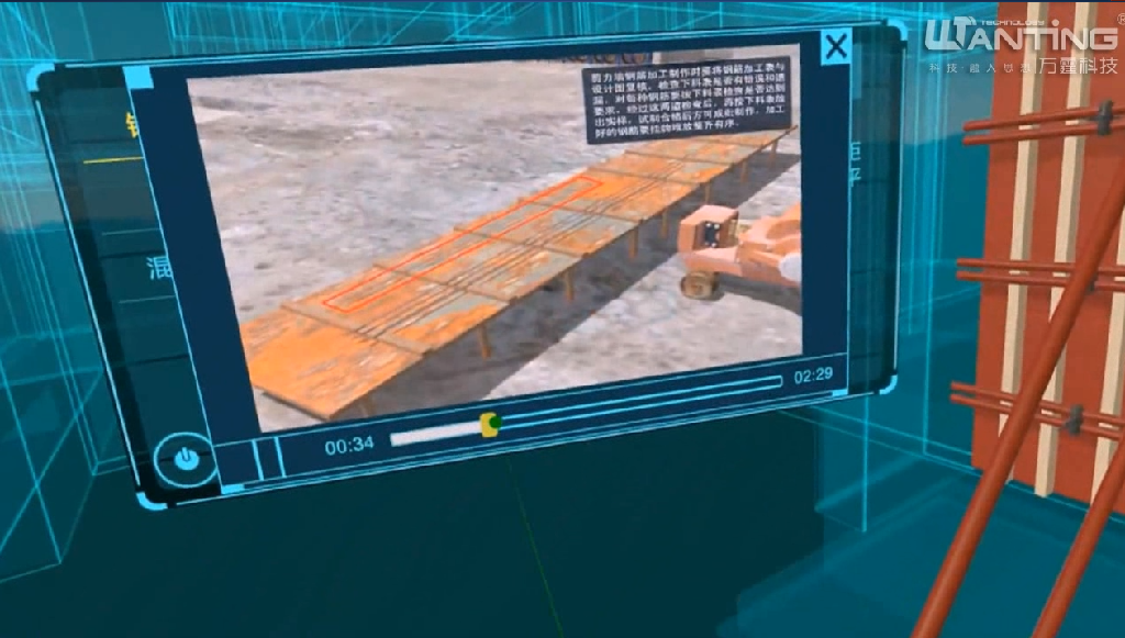 4、全息施工影像:在场景中,触发相关热点,可以打开VR 全景视频,展现的内容包括施工工艺、施工现场作业等,结合虚拟头盔,在视频的体验上会更加的身临其境。