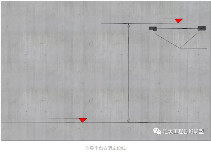 根据剪力墙或柱子+1m线弹出休息平台安装时上边面控制线,同时根据预留孔洞及相邻墙体设置标示出休息平台的水平控制线,如下图所示。安装时休息平台及楼梯段与相连墙板或柱子之间预留2cm空隙,为砂浆抹灰层预留空间。