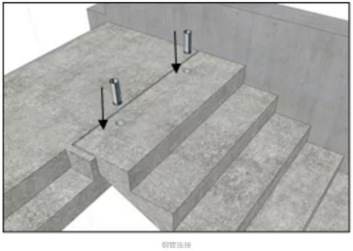 4、铰连接安装:楼梯段校正完毕后,用钢管将梯段上口预留孔与休息平台预留孔用进行连接,如下图所示。钢管外径略小于孔洞口径即可。